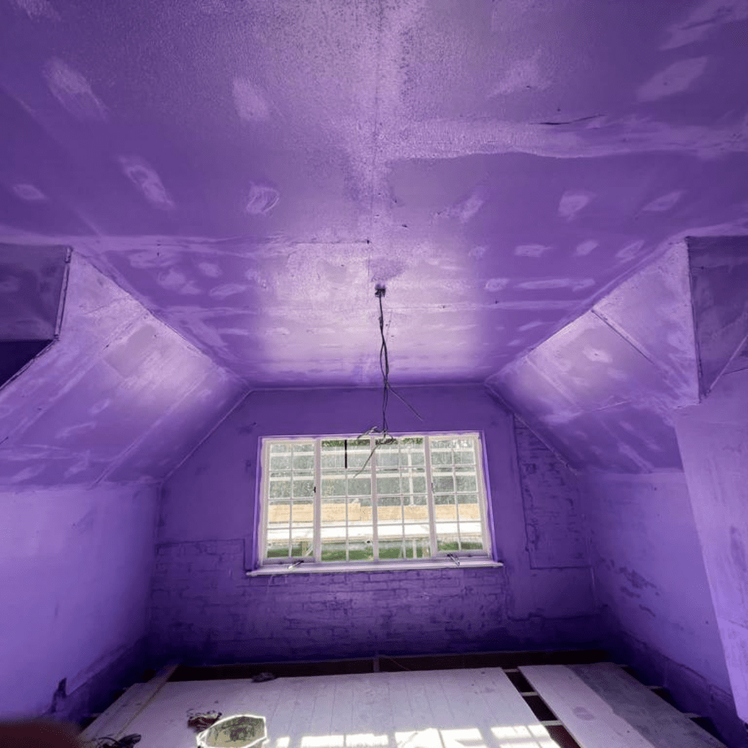 Passive Purple® is a next-generation, liquid-applied airtight coating designed for the warm side of the insulation in any building envelope. Applied by airless spray, roller, or brush, it seals even the most difficult areas—wall-to-floor junctions, roof connections, joists, and mixed-material transitions—creating a continuous, flexible, and highly durable airtight layer.